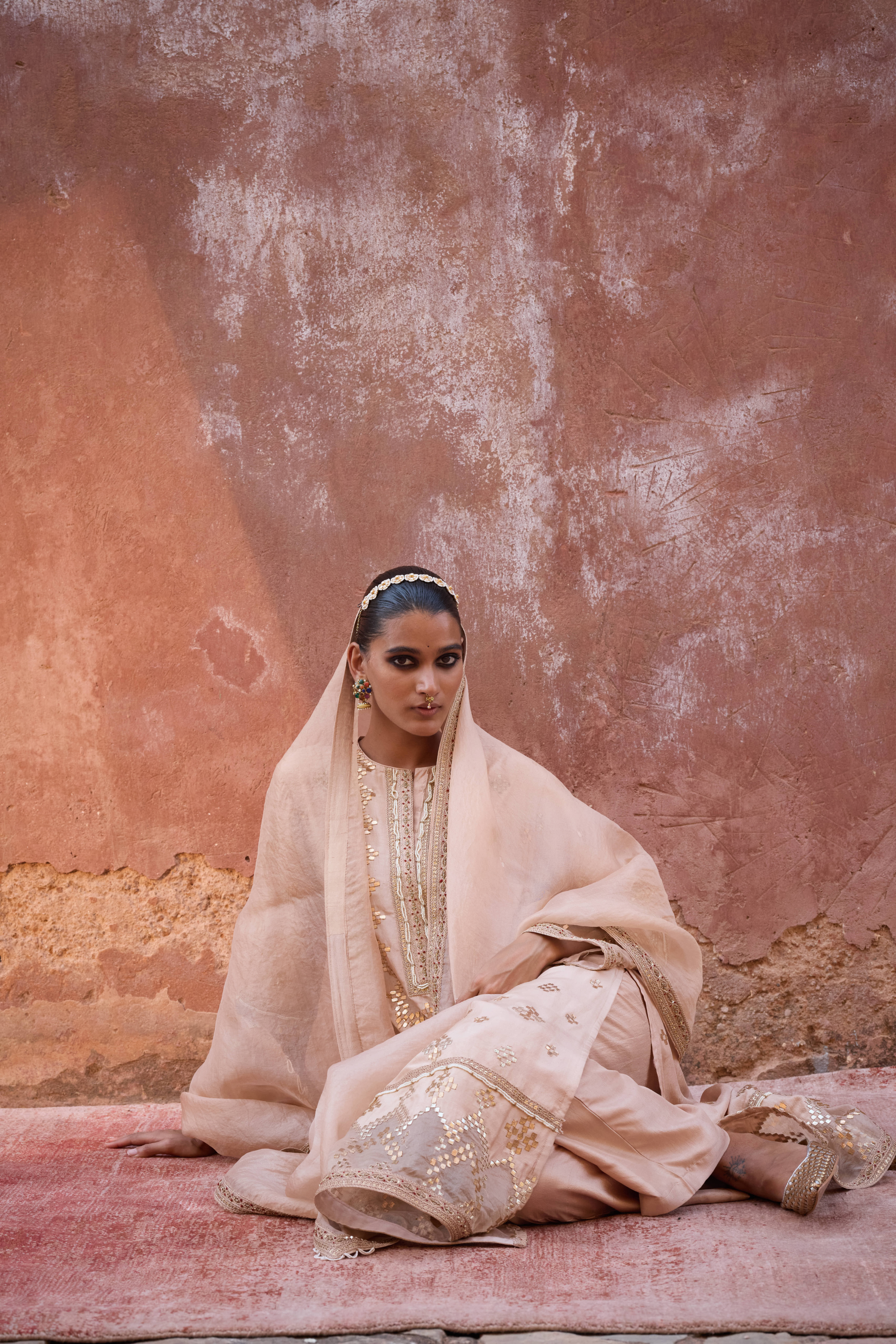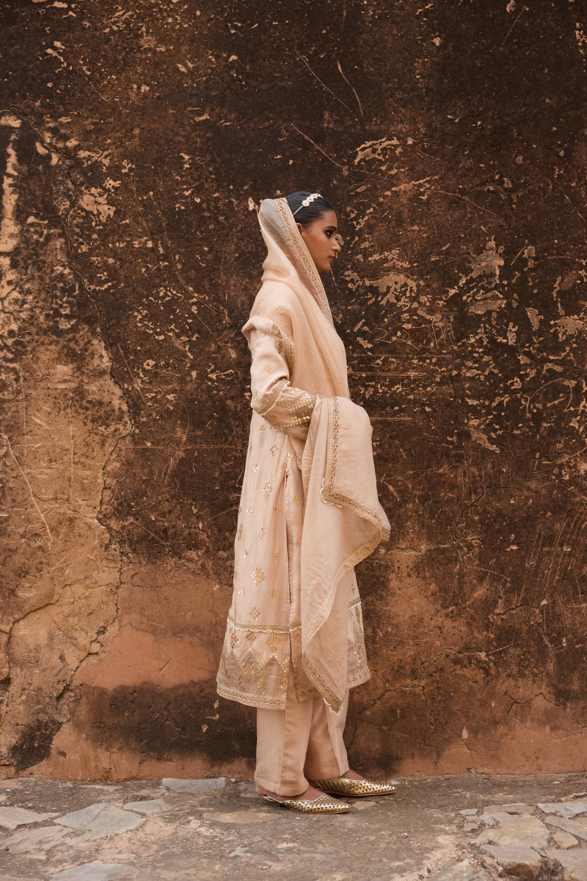 This kurta set is adorned with intricate all-over geometric Kacchi Patti copper gota embroidery and exquisite Marodi work. It is paired with a matching embellished organza dupatta and silk pants