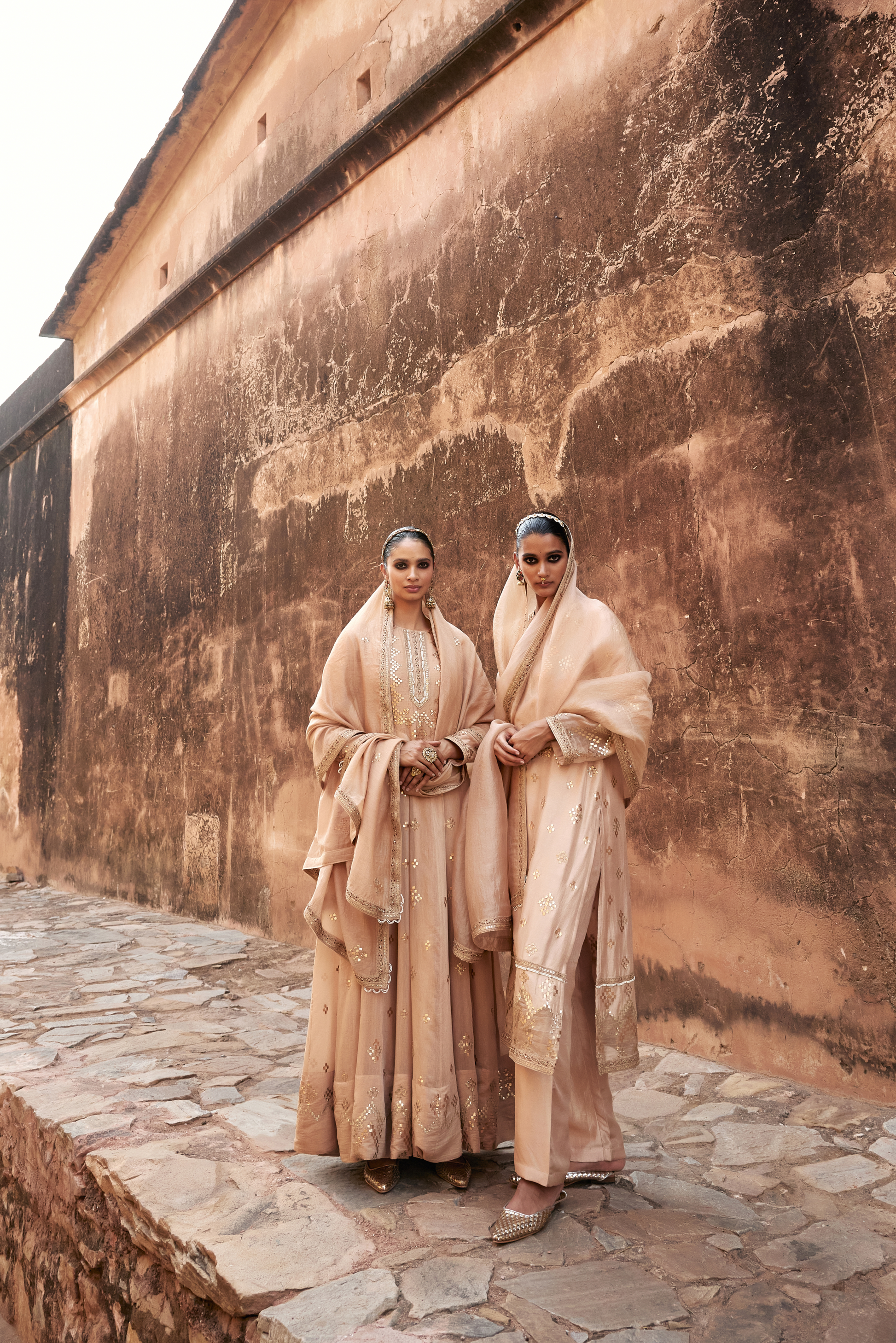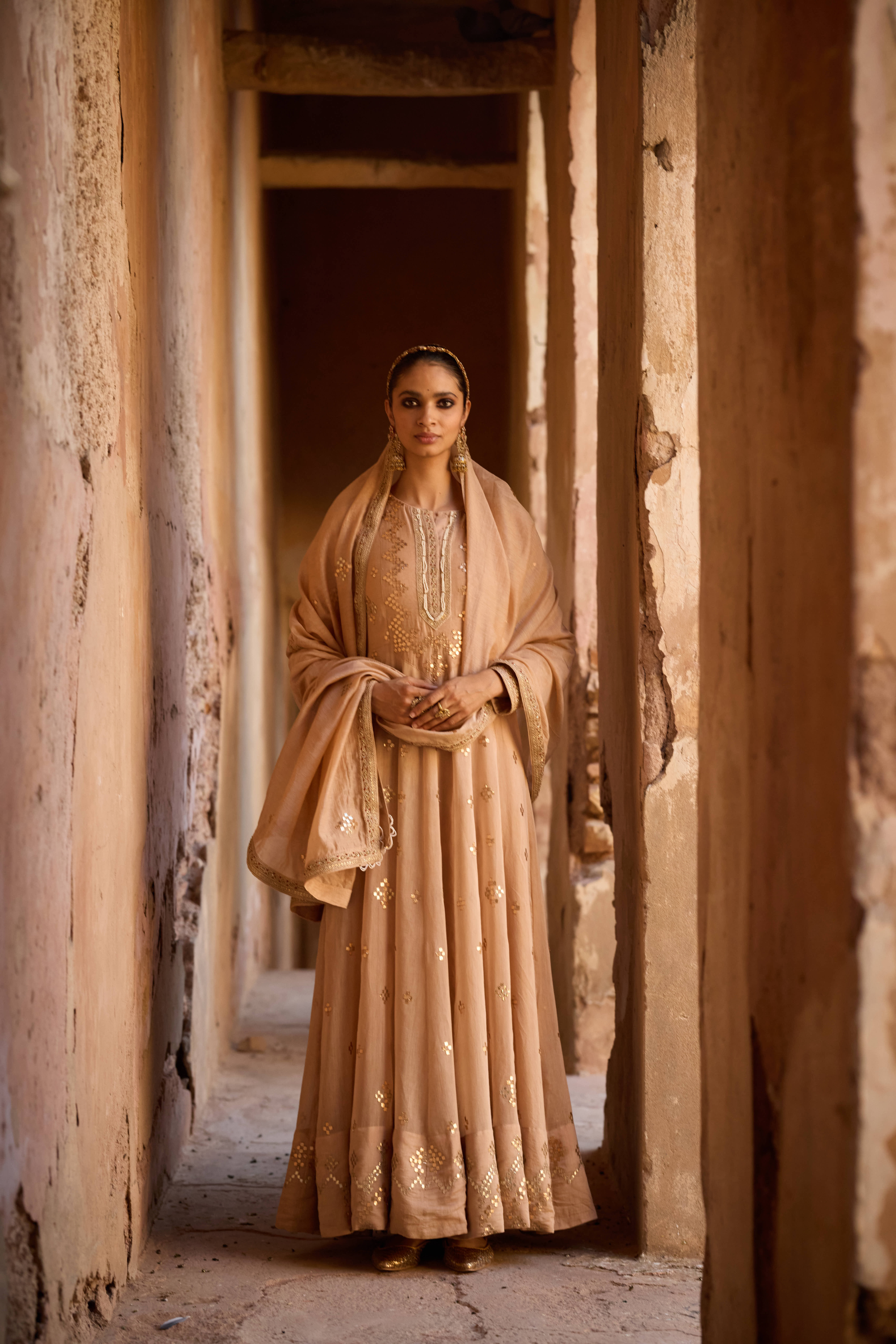 This Anarkali showcases intricate all-over geometric Kacchi Patti copper gota embroidery and Marodi work. It is paired with a matching dupatta and churidar pants.
