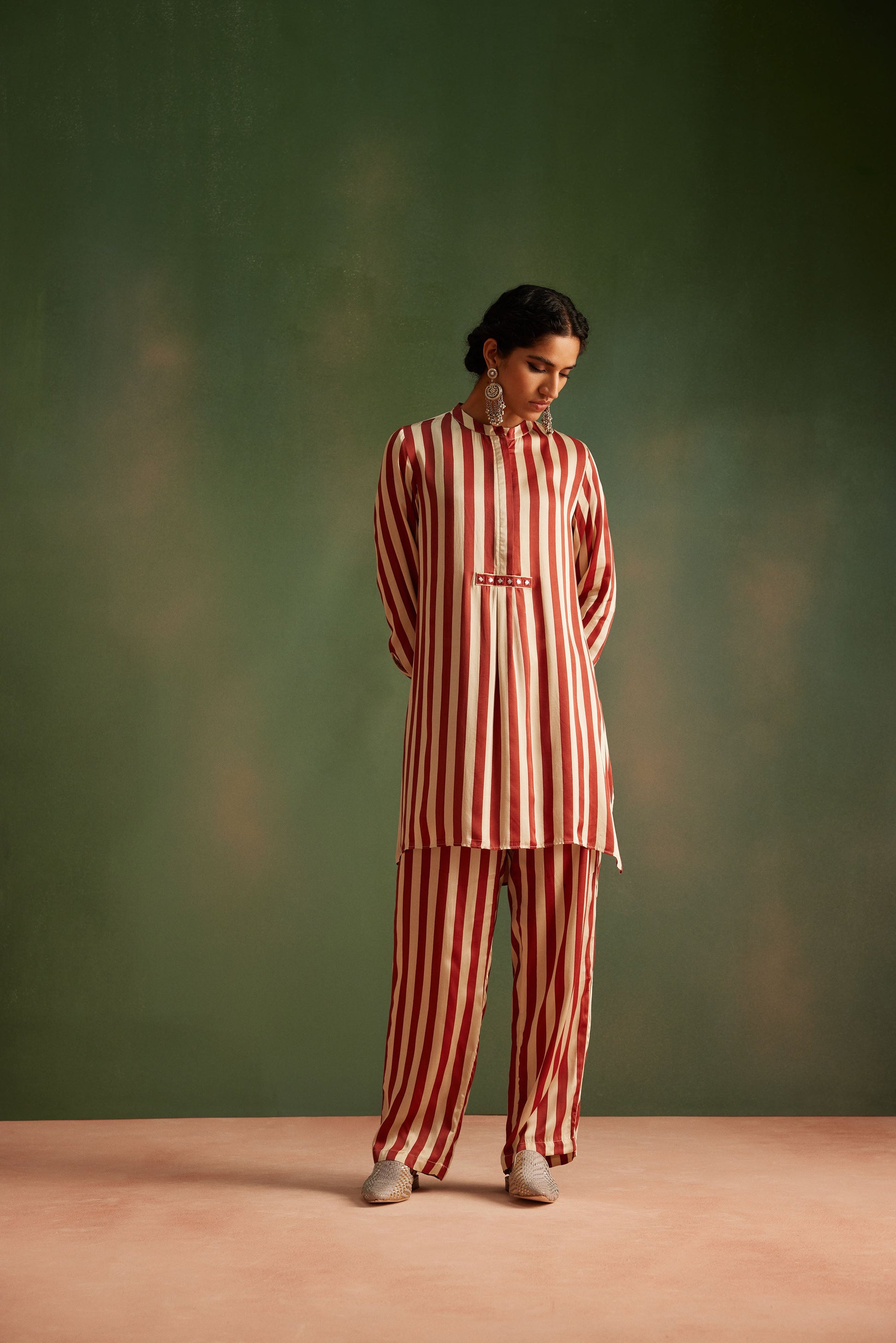 This hand block printed satin co-ord set has mirror work in detaillings. It comes with matching pants.