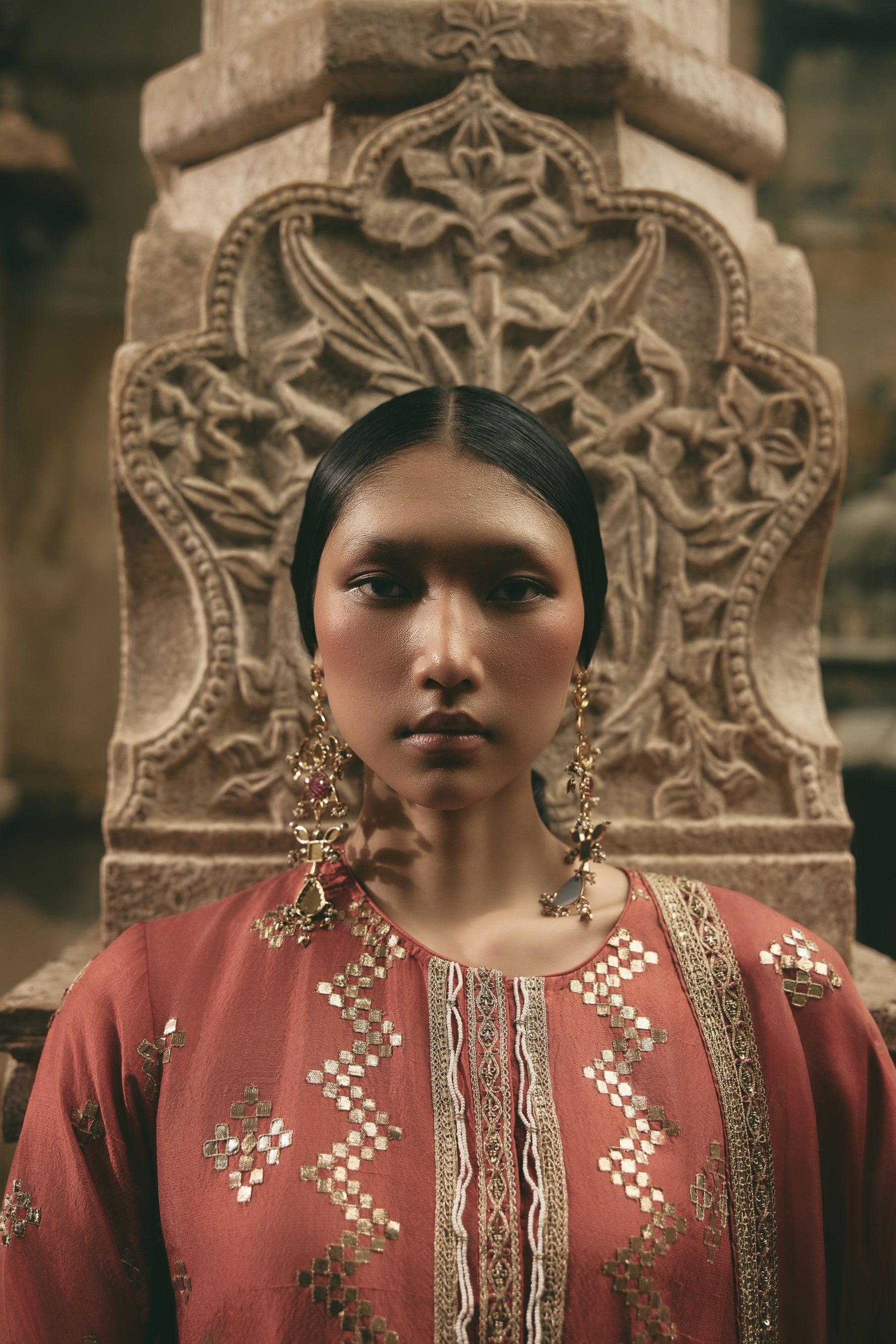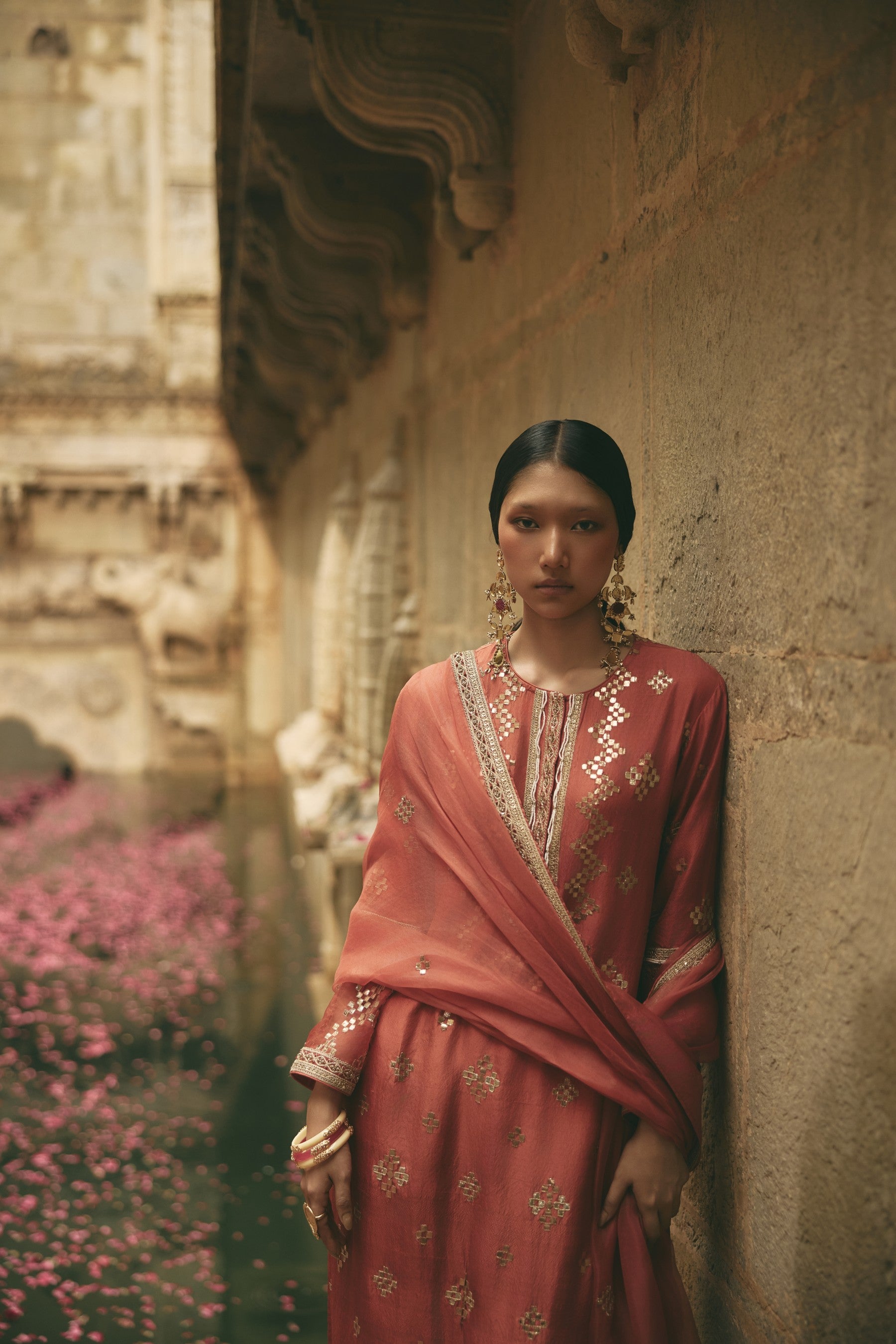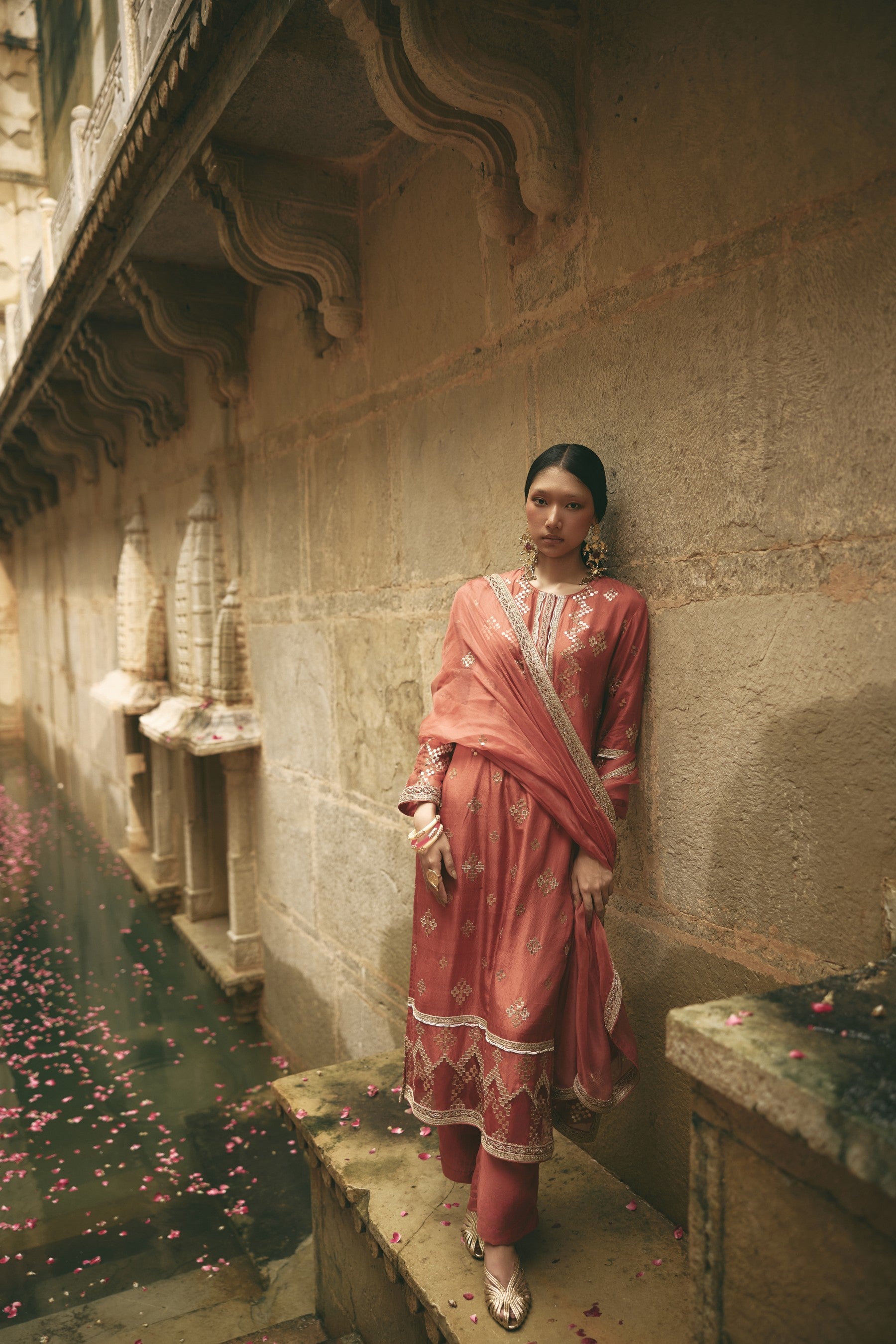 This Silk Kurta Set is adorned with all over kachi patti gota & dori embroidery. It is paired with silk pants & organza handwork dupatta.