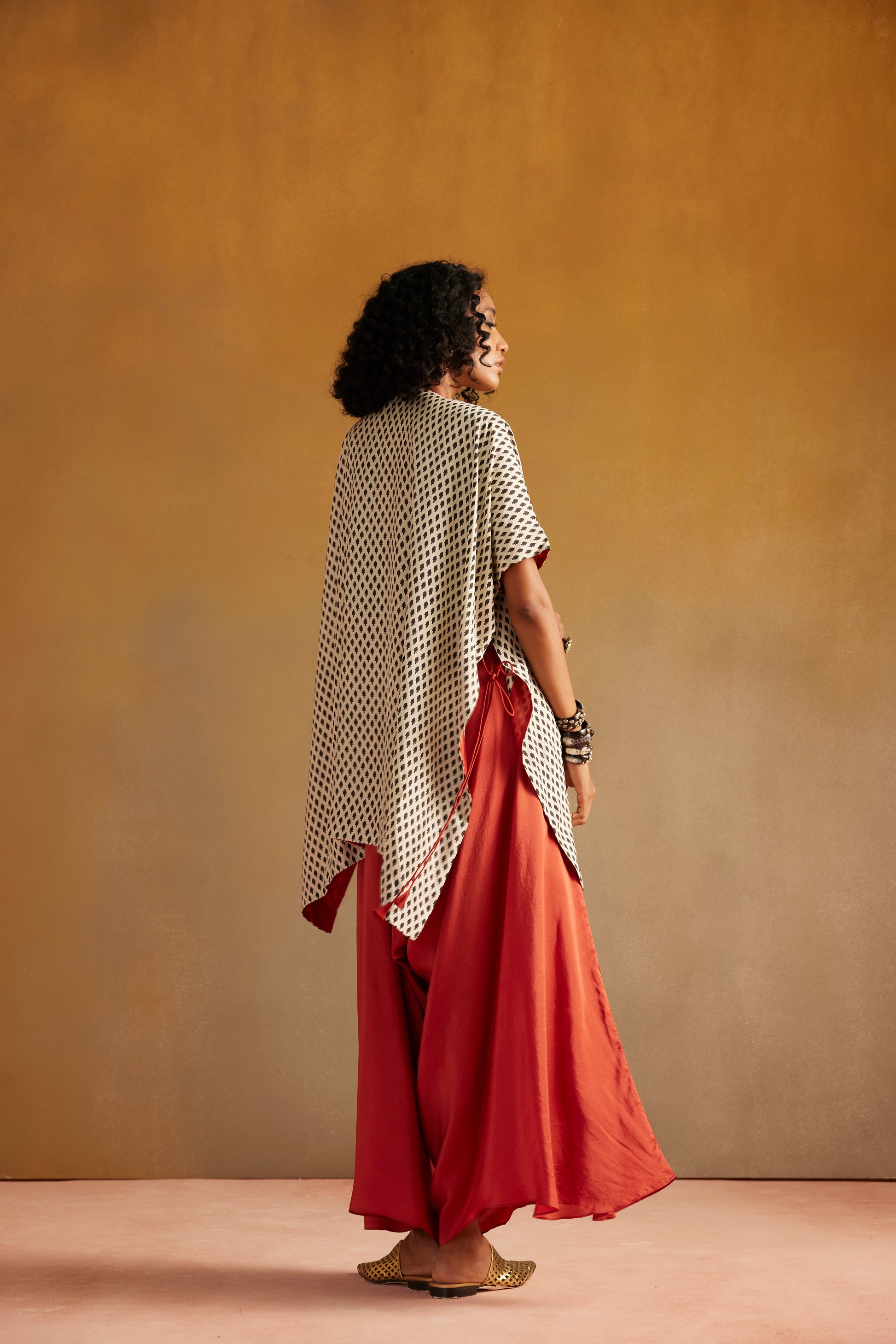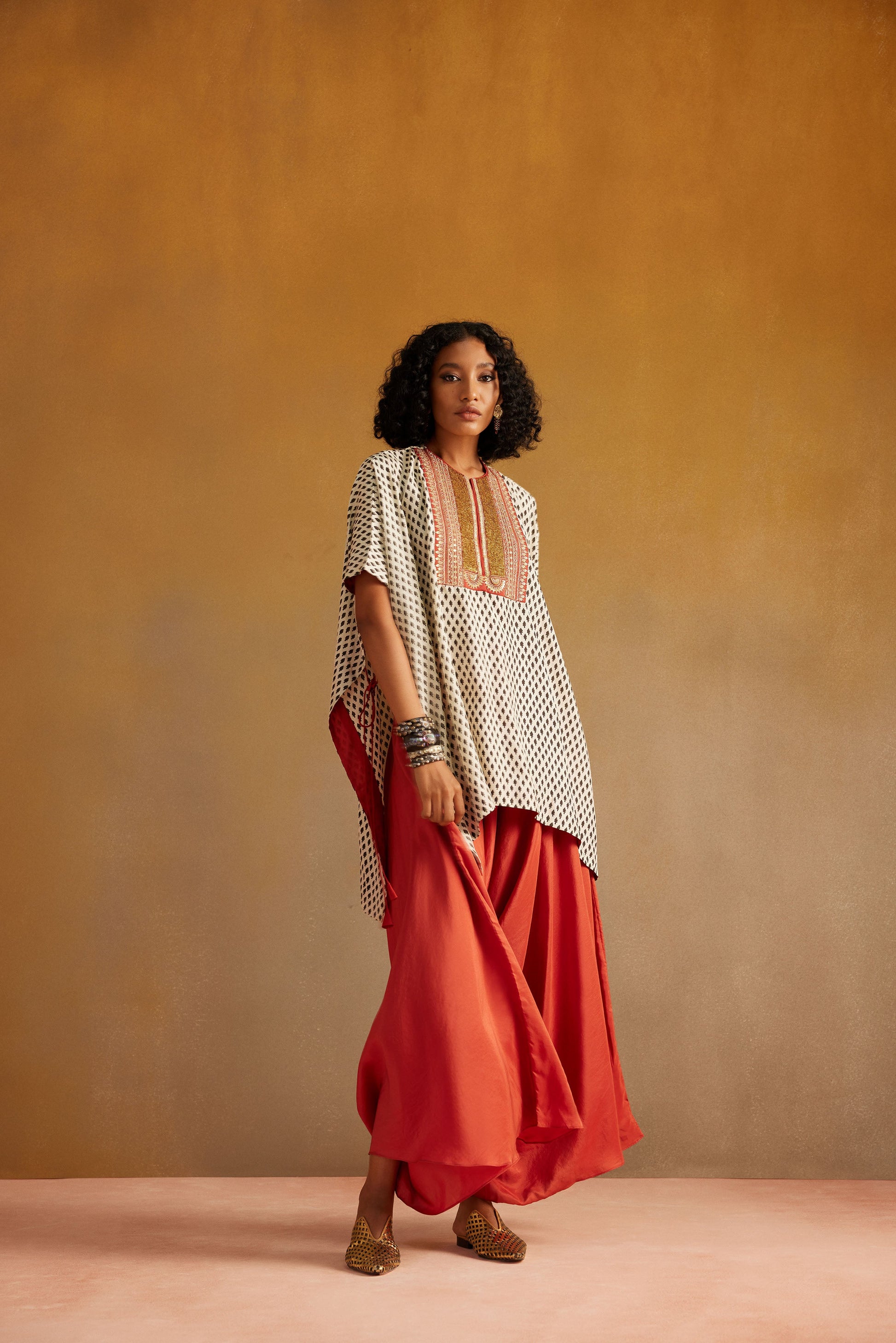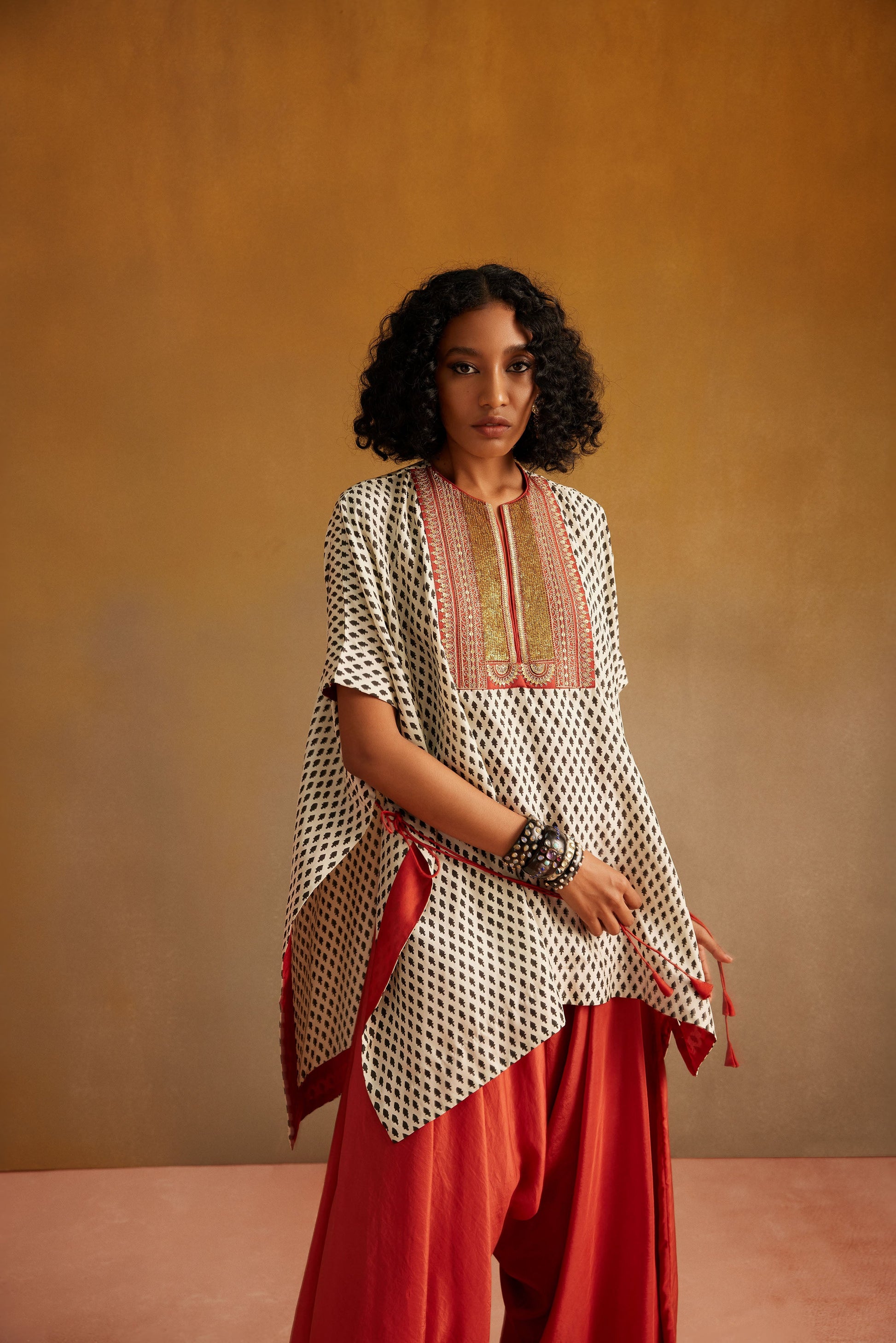 This Kaftan is cut in pure silk with fadat hand block print. It has a heavy metal sequence and dori worked yoke and tie up detailling on the sides. It is paired with red dhoti pants.
