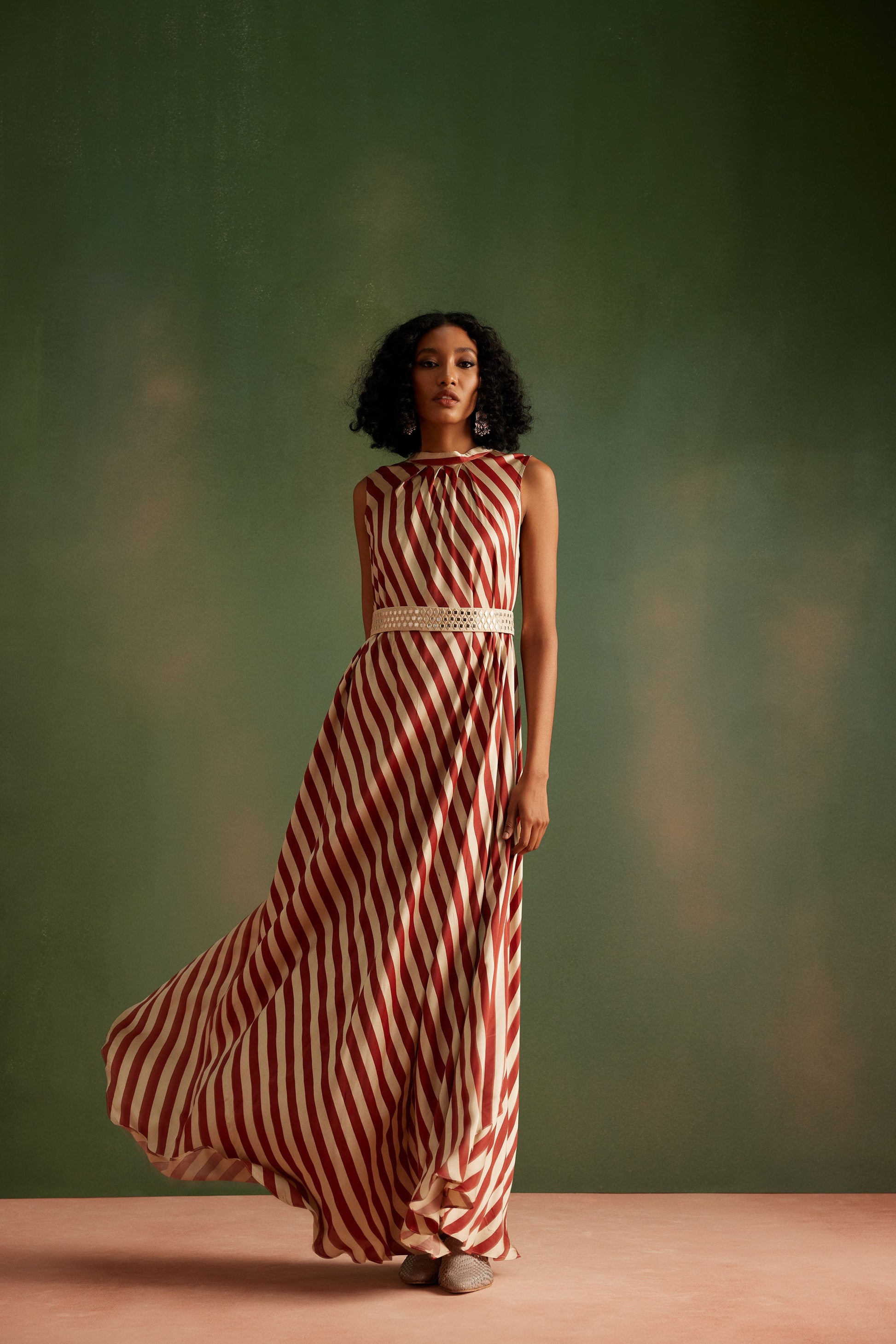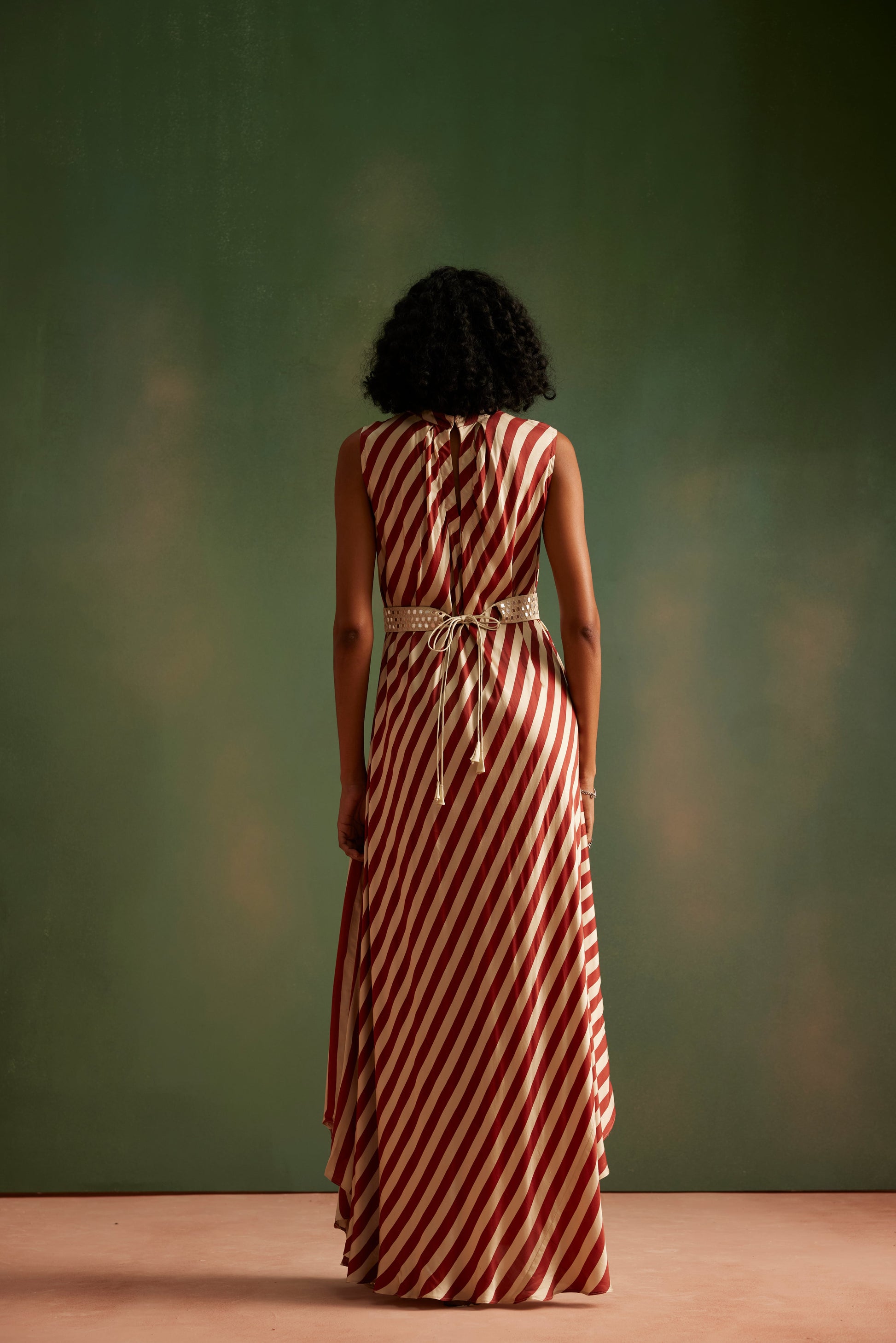 This flared dress is cut hand block printed satin fabric, it comes with a mirror worked belt.