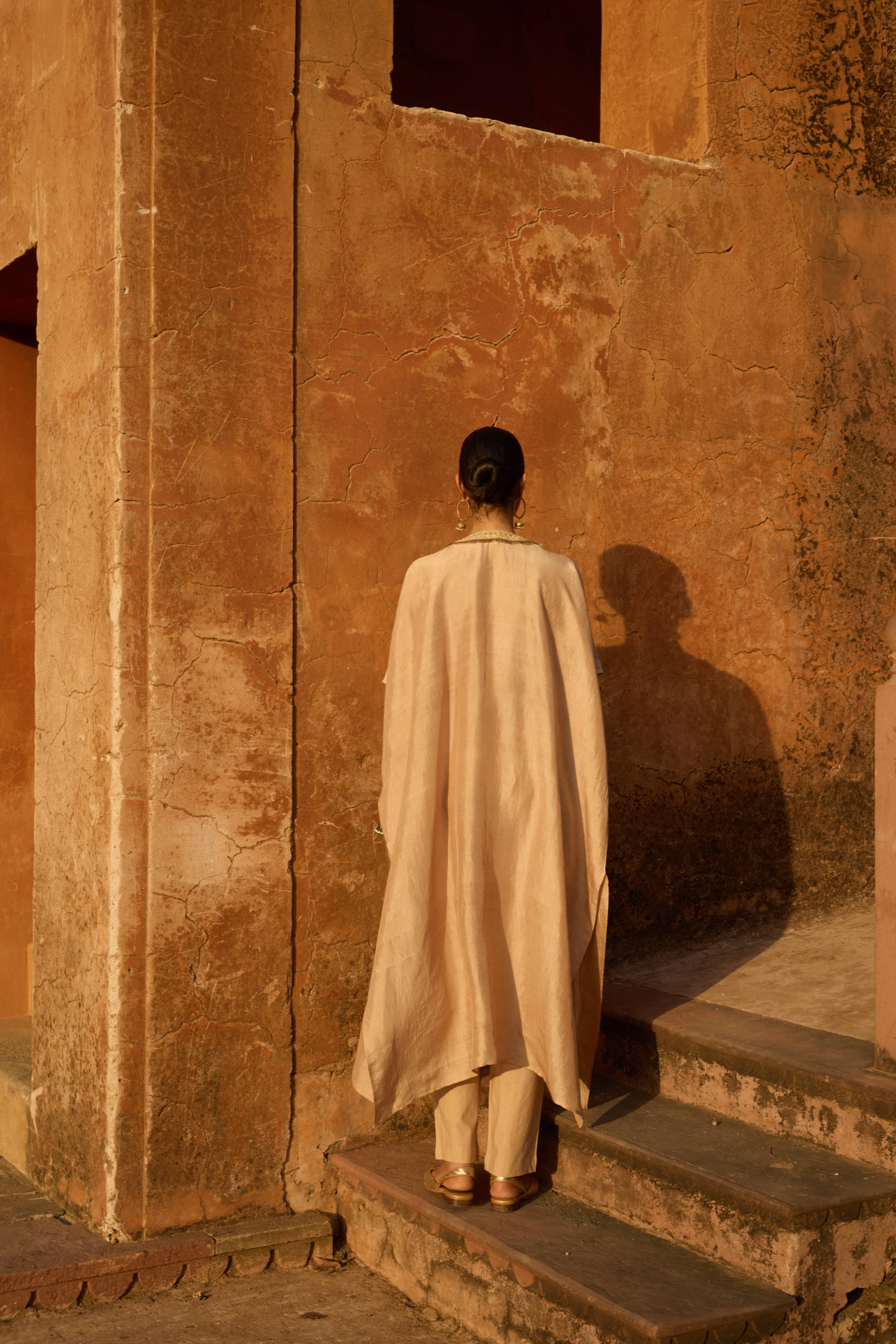 This long kaftan set is crafted from pure mulberry silk and features a designed yoke with gota and marodi work. It is paired with matching cotton pants
