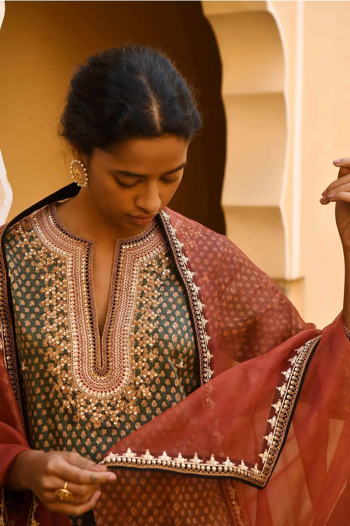 This kurta set has Fadat Dhaniya print all over,it . It is handblock printed using natural dyes. It features heavy marodi work on yoke and sleeve. It comes with worked pants and a katan silk dupatta with dori work borders.