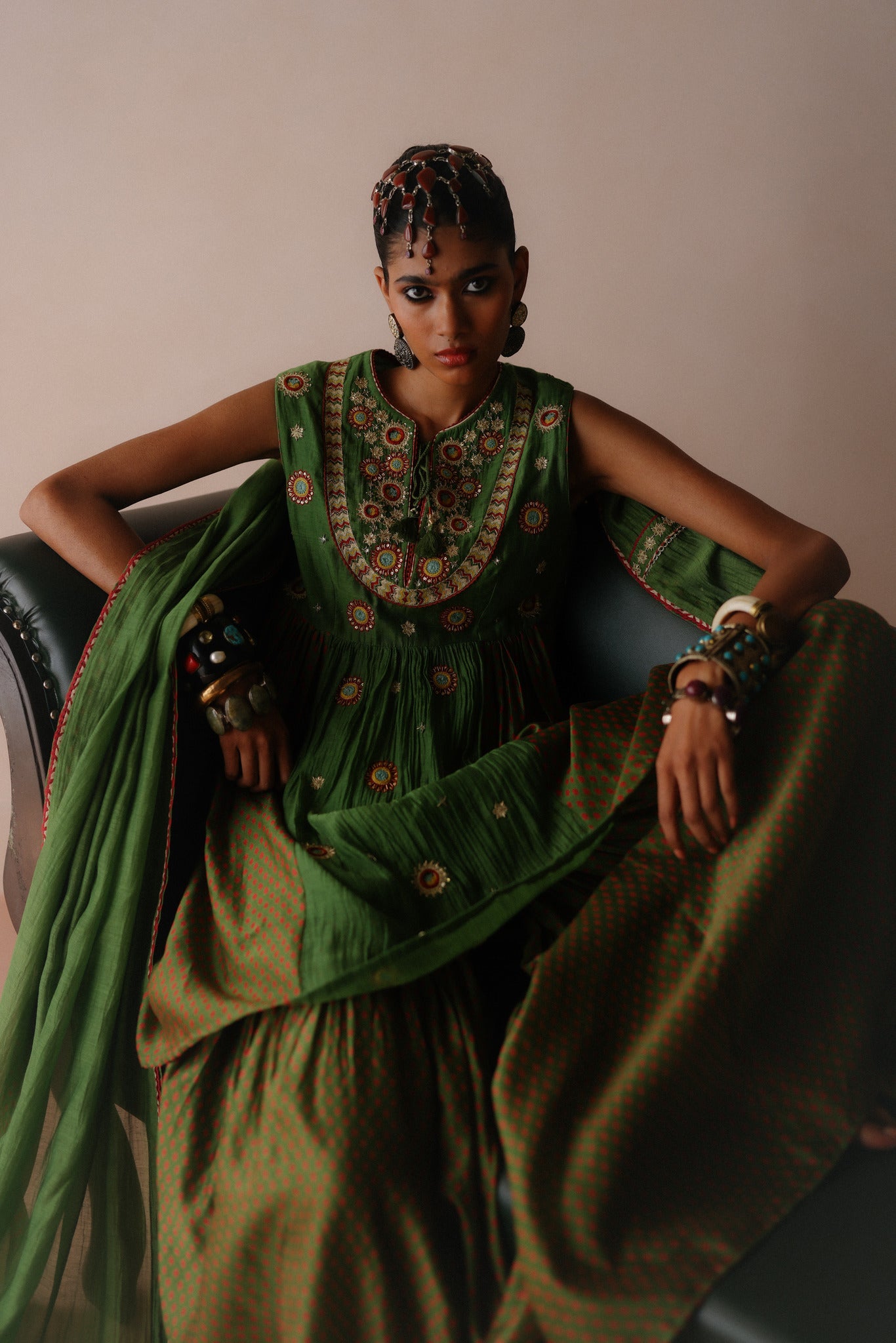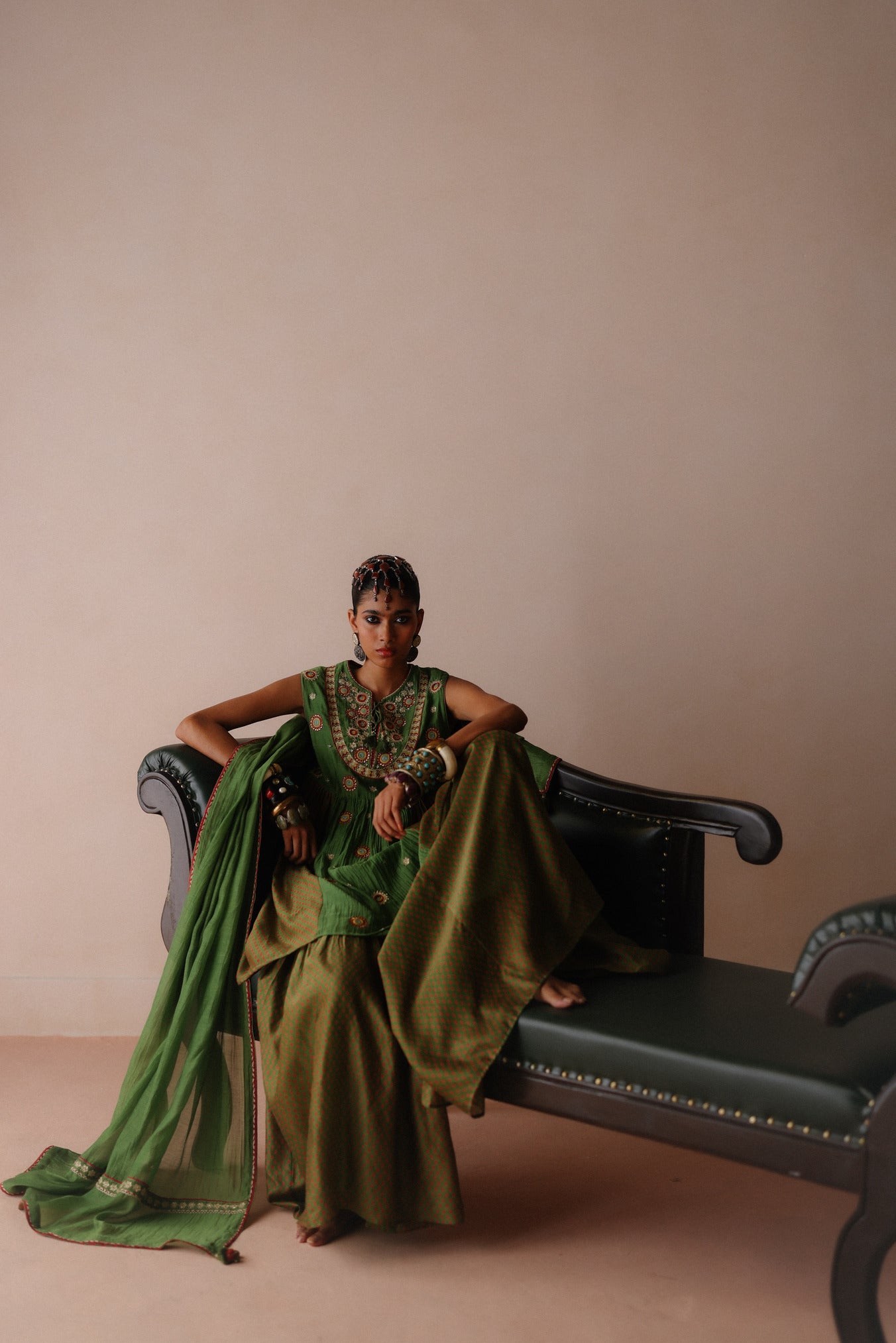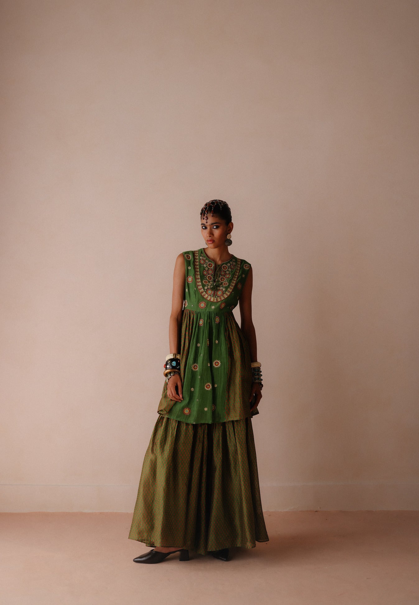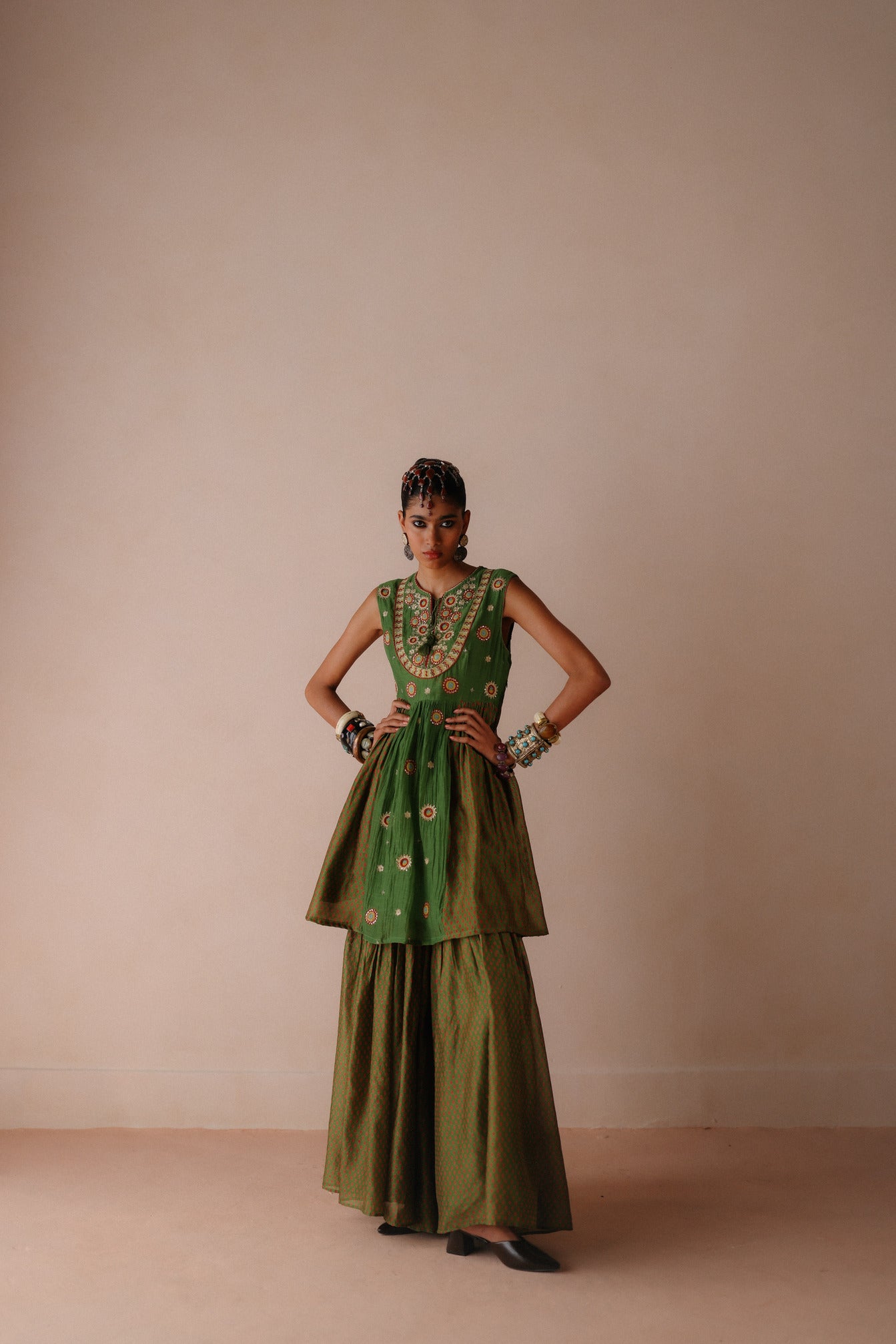 This Peplum Top features intricate thread and dabka embriodery on the yoke, with scattered motifs throughout. It is paired with a printed sharara and a plain green dupatta accented with matching embroidery and print detailing.