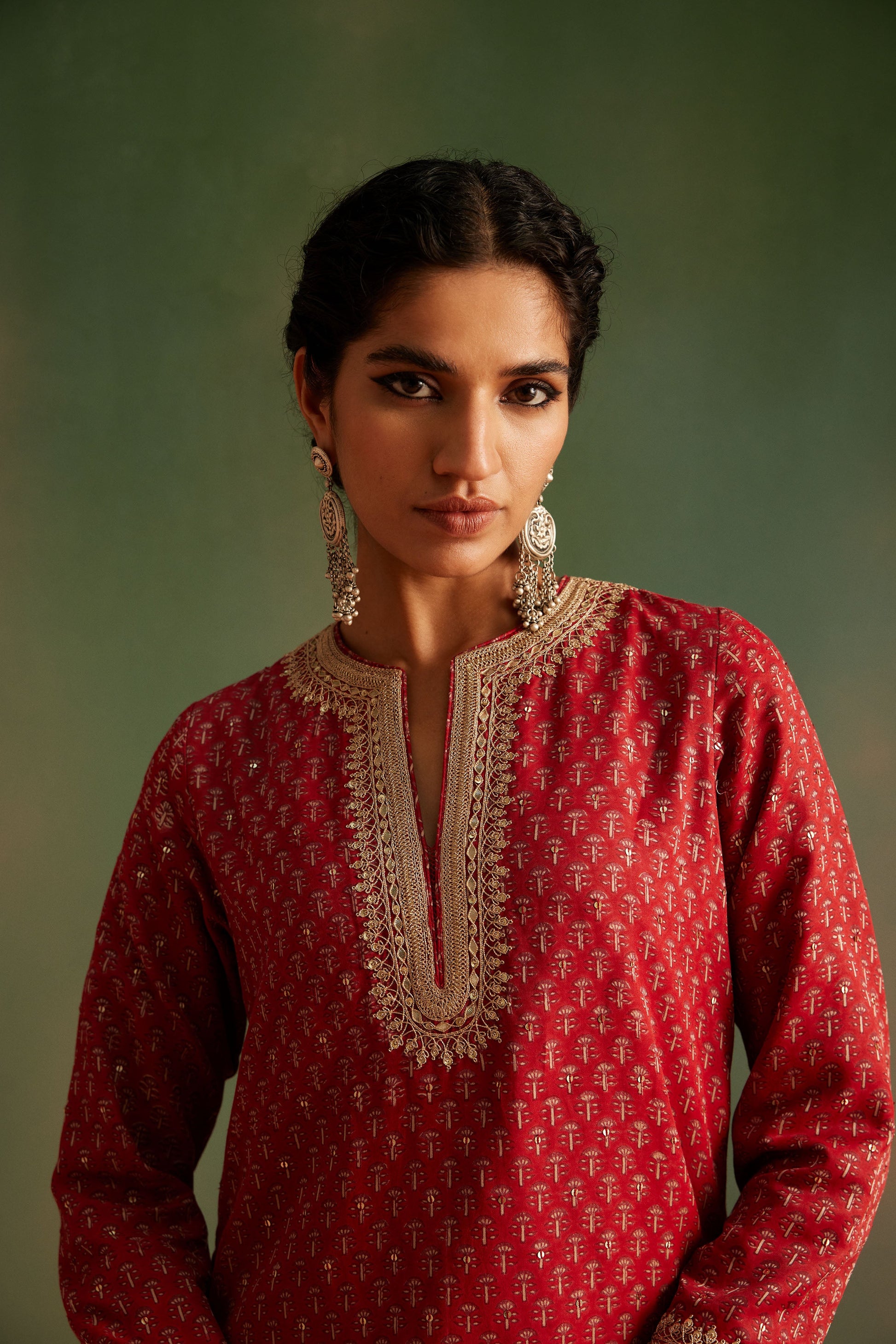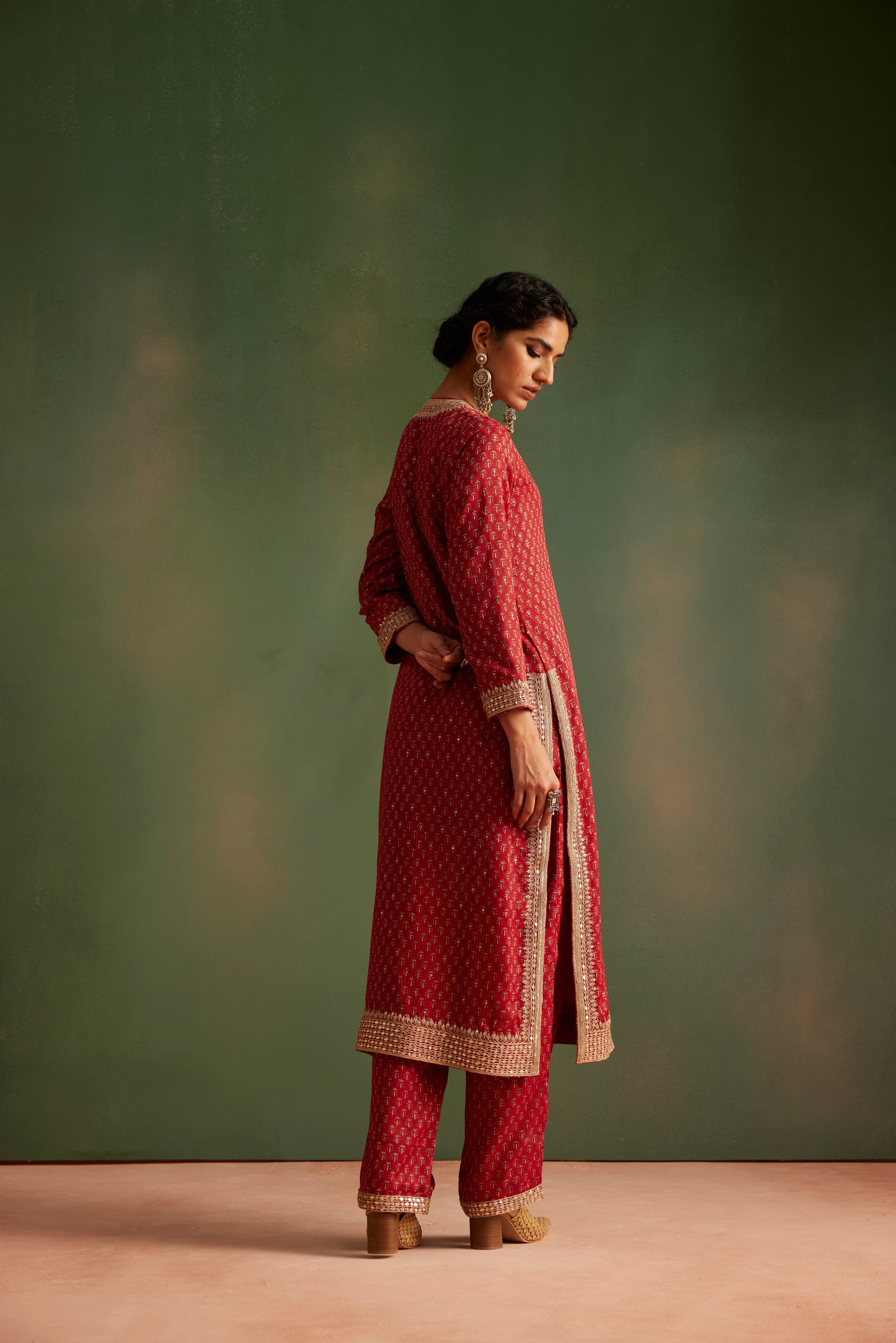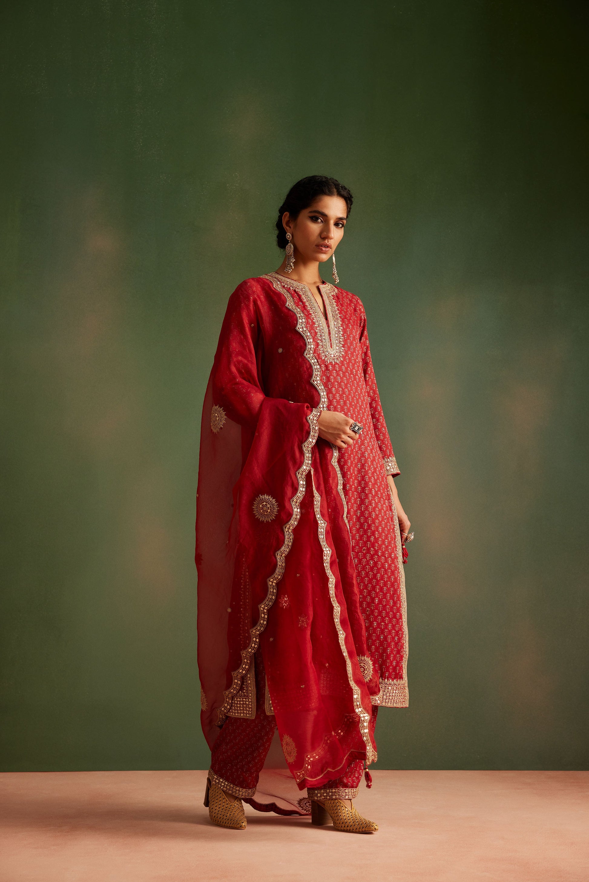 This fadat hand block printed kurti has intricate dori and gota work, it is paired with matching pants and an organza worked dupatta.