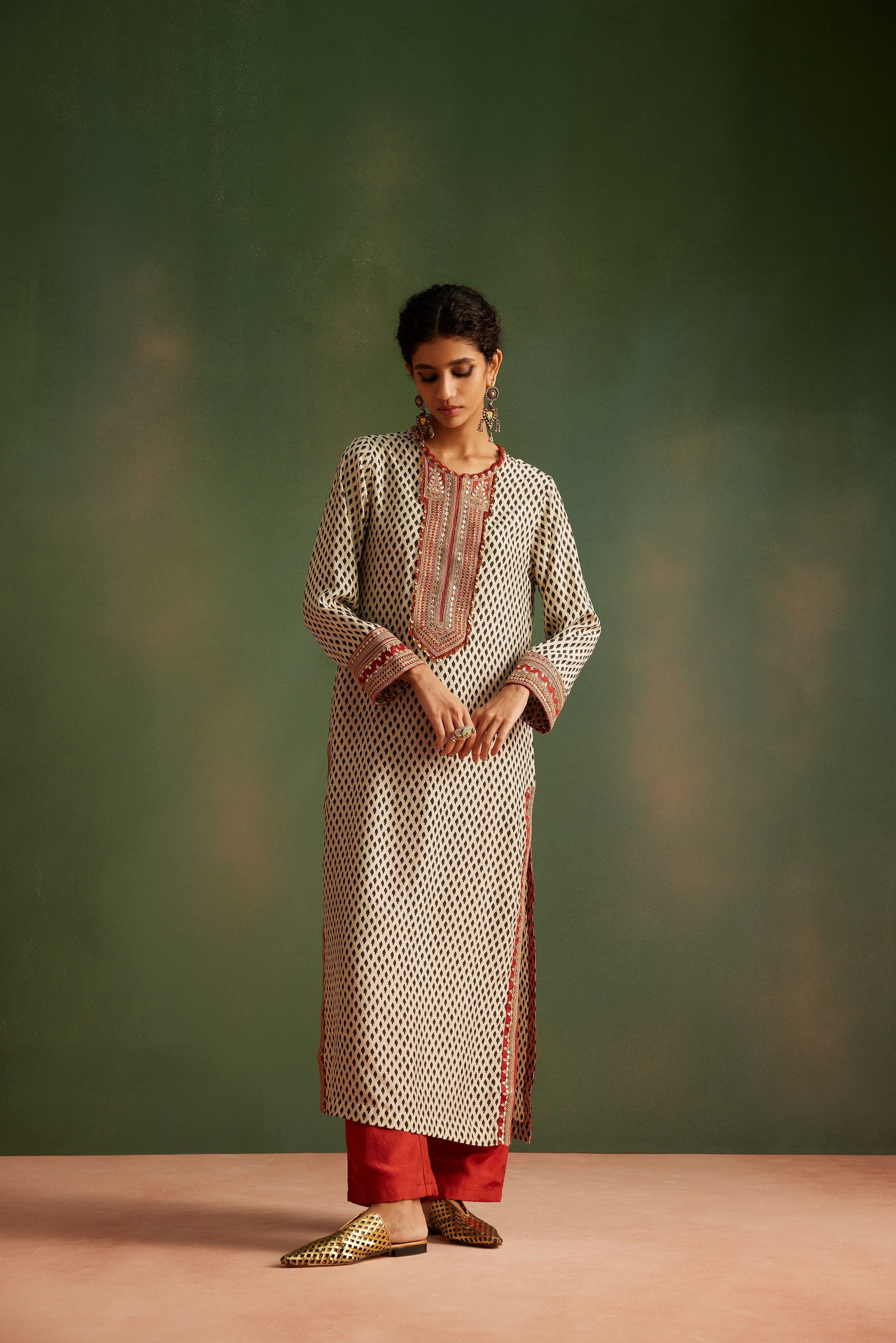 This fadat hand block printed kurti is cut in pure silk, has intricate dori and gota work, it is paired with red silk pant. It comes with an off-white dupatta.
