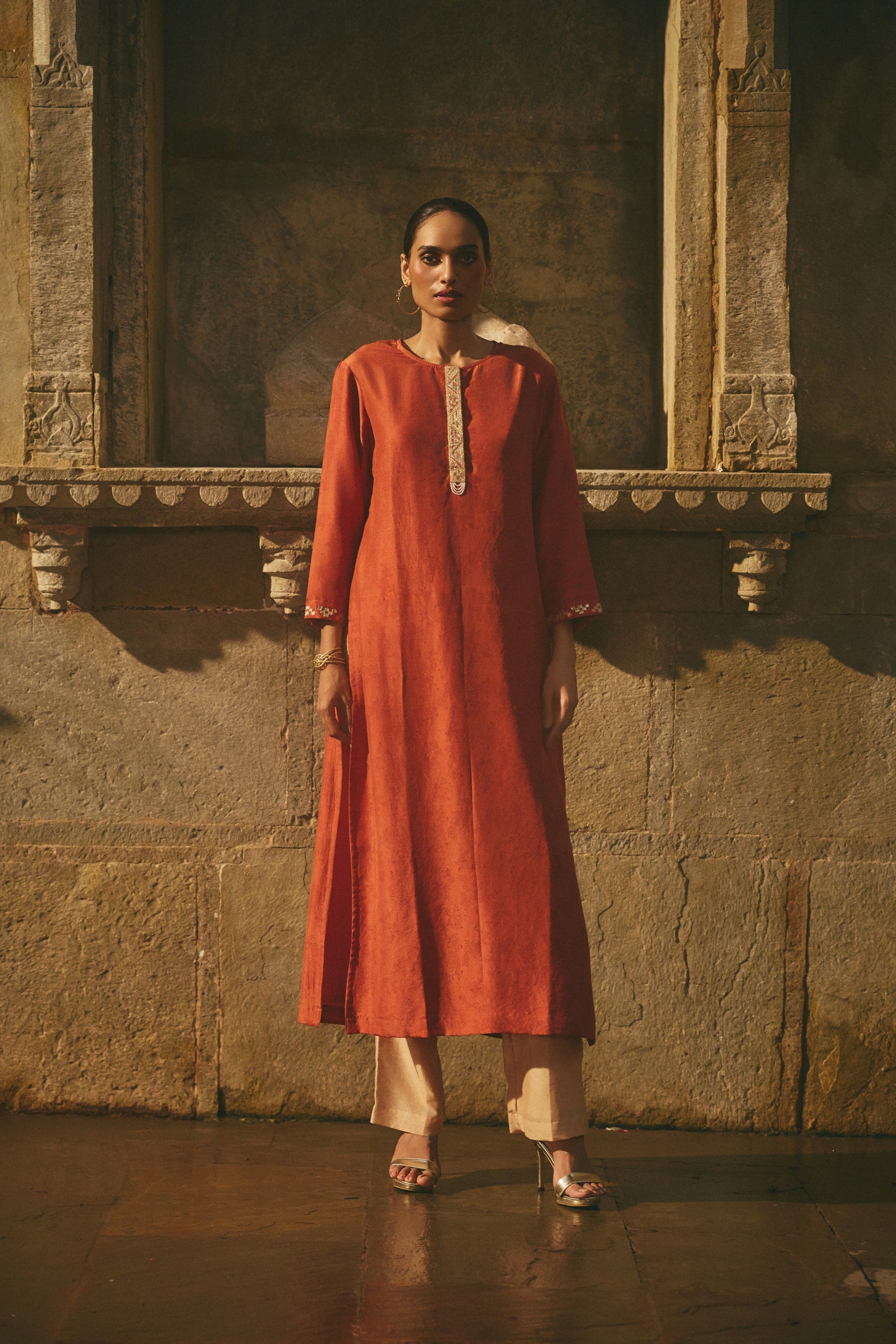 This Printed Red Silk Kurta features delicate gota and dori work, enhanced with intricate moti detailing.