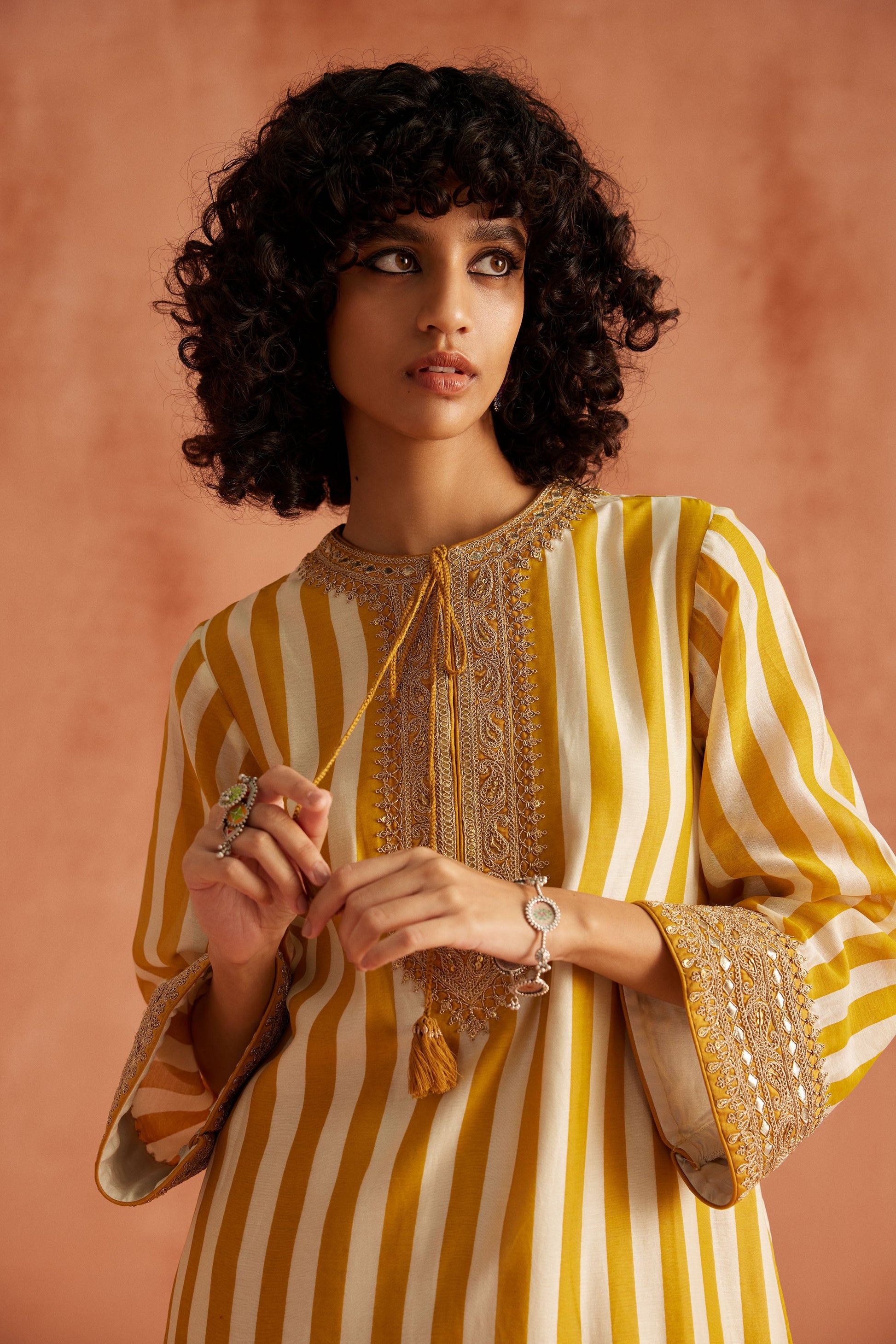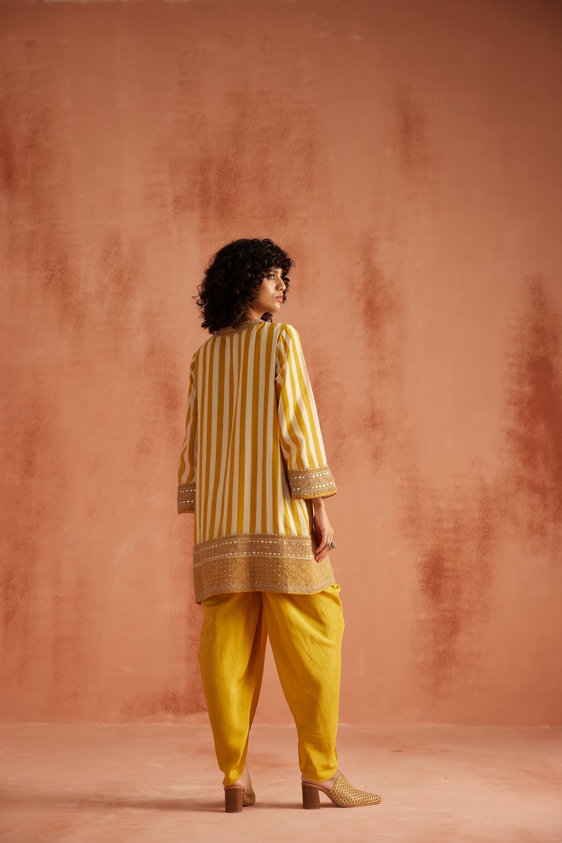 This Short Kurti is cut in handloom chanderi and is printed with hand blocks. It has intricate dori work on neck, sleeves and botoom panel. It comes with silk dhoti pants.