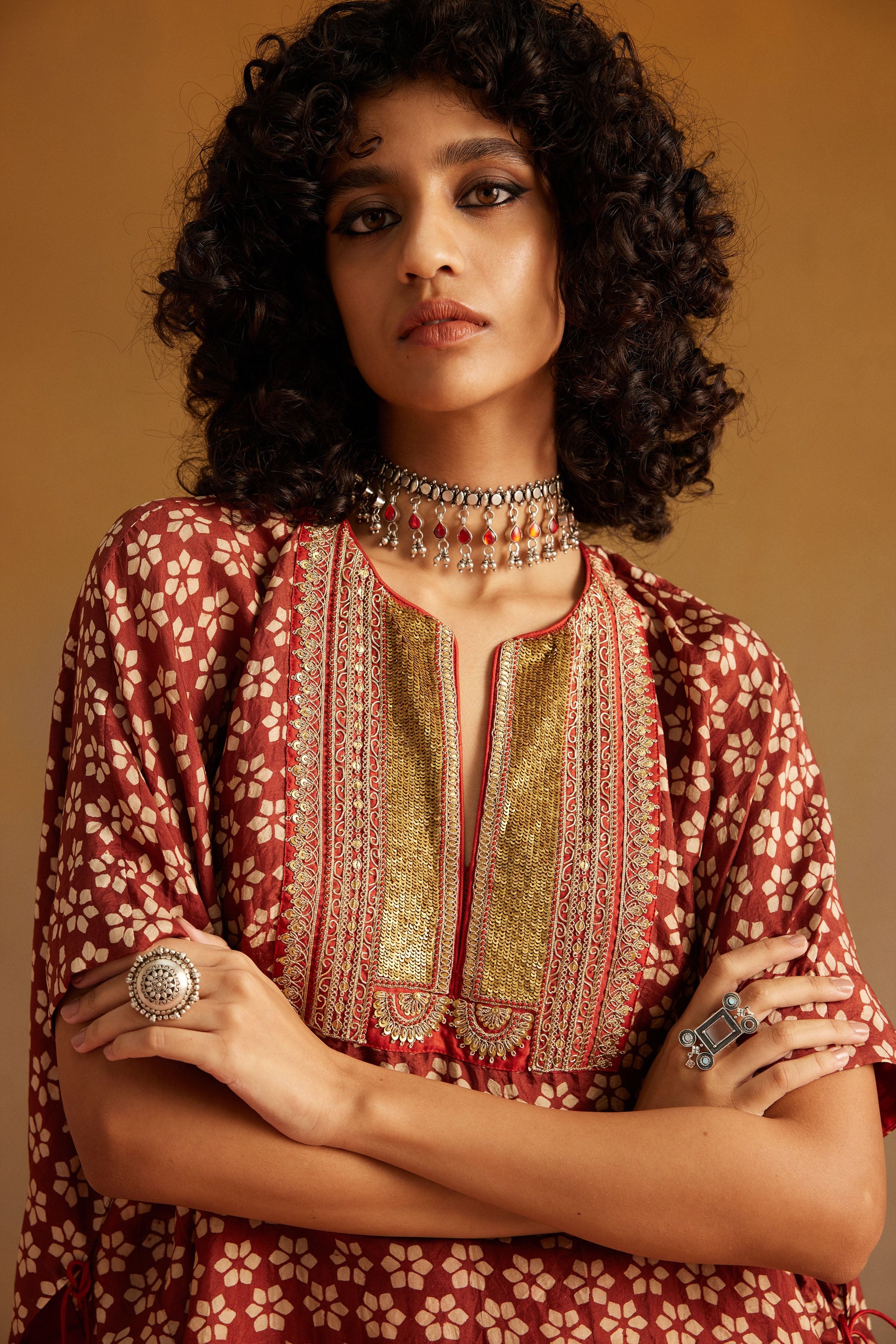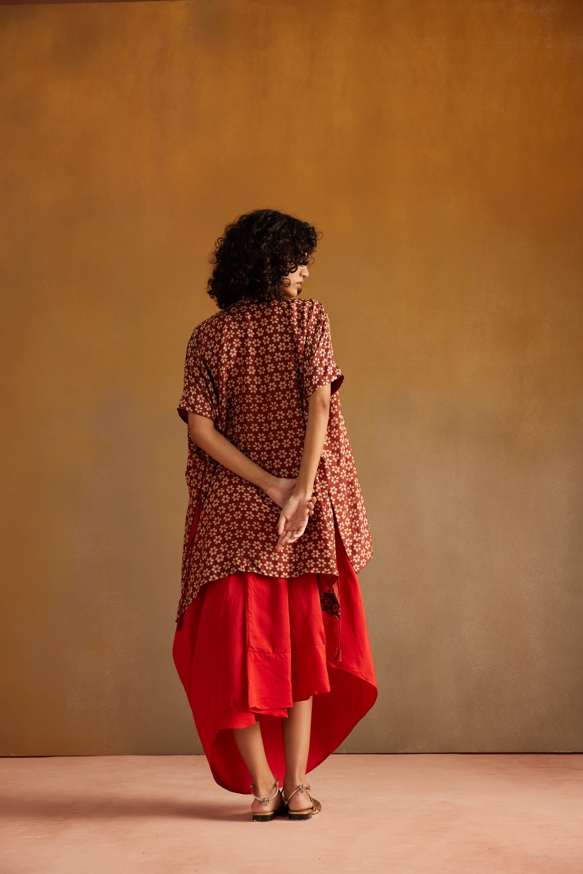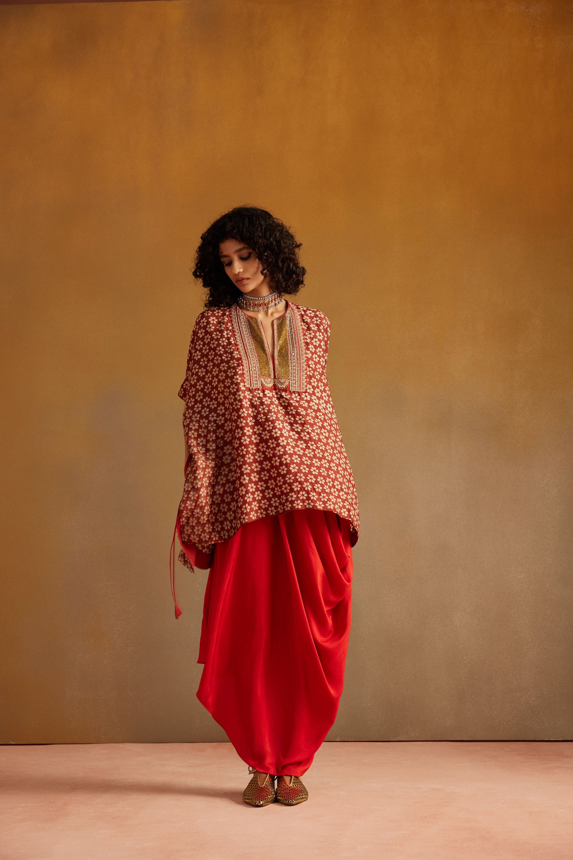 This Kaftan is cut in pure silk with fadat hand block print. It has a heavy metal sequence and dori worked yoke and tie up detailling on the sides. It is paired with orange silk draped skirt.