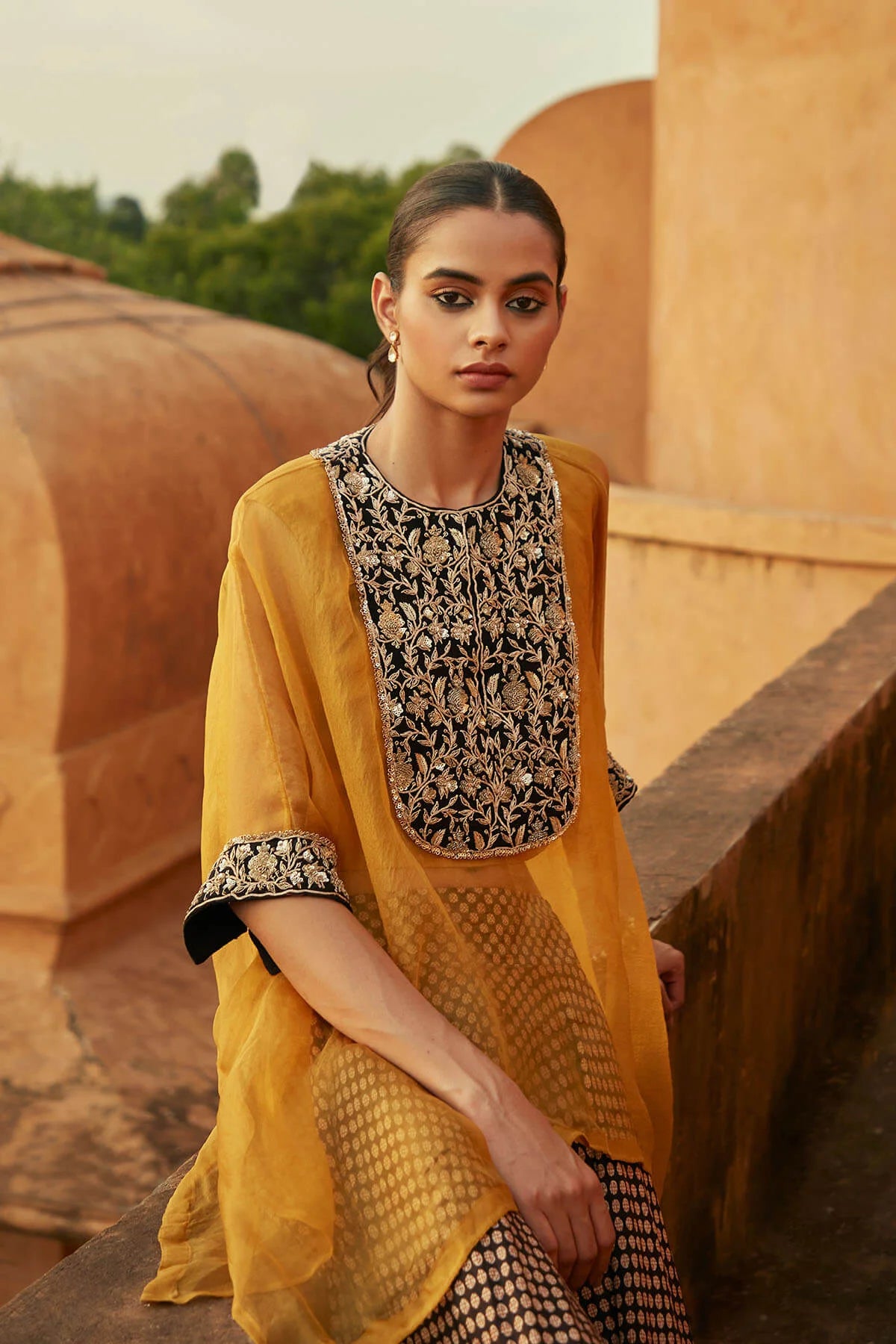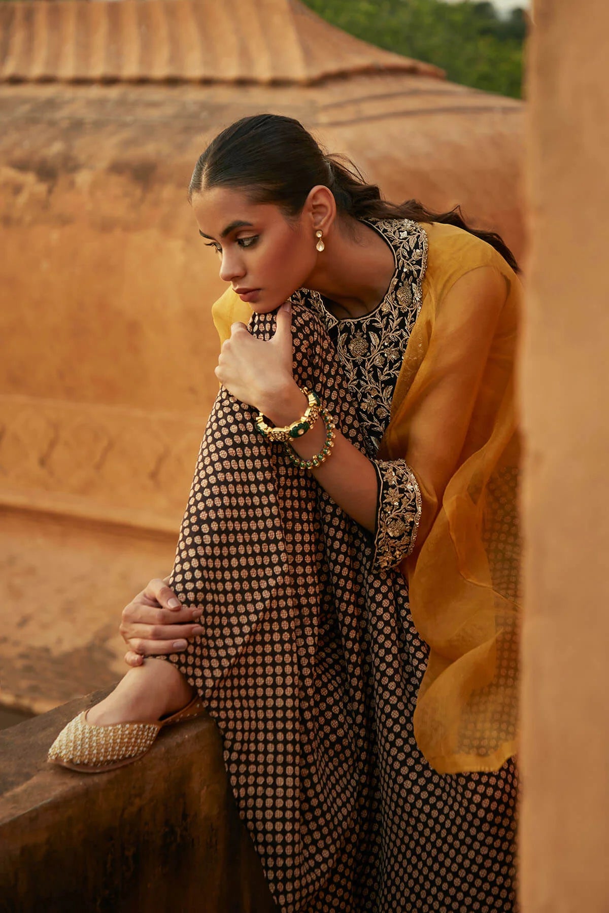 This cape is cut in pure handloom katan silk, has intricate zardosi work on yoke and sleeves. It comes with cotton lycra slip and black bagru Fadat handblock printed dhoti pants.